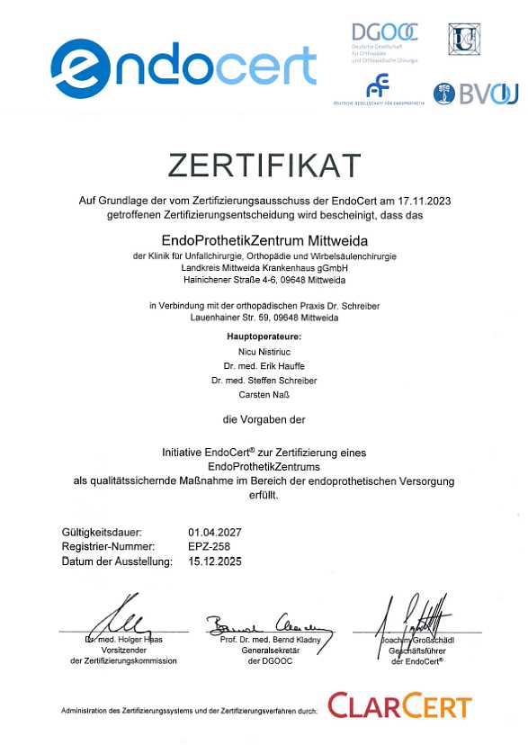 Seit April 2014 ist die Landkreis Mittweida Krankenhaus gGmbH als EndoProthetikZentrum (EPZ) zertifiziert.